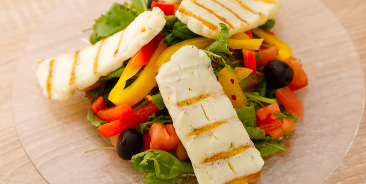 キプロスの代表的な焼きチーズであるハルミチーズとスーパーフードであるキヌアをふんだんに使った健康的なサラダ。